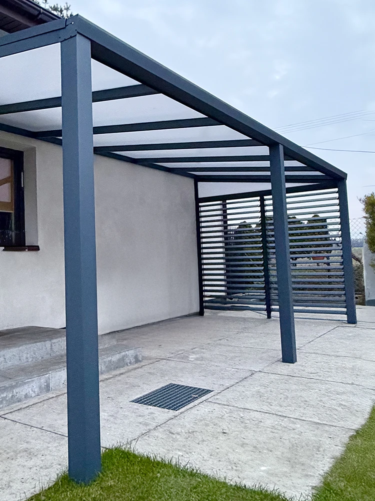 Zadaszenie z podporami, skutecznym uszczelnieniem przy elewacji oraz zabudową boczną w postaci żaluzji ruchomych chroniących przed wiatrem, śniegiem oraz słońcem.