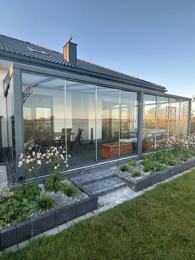 Nasze zadaszenia tarasowe można w dowolnym momencie rozbudować o szklane i przesuwne ściany tworząc tym samym ogród letni, doskonałe miejsce na odpoczynek w okresach przejściowych, kiedy za oknem wiatr Państwo dalej w spokoju mogą korzystać ze swojej przestrzeni tarasowej.